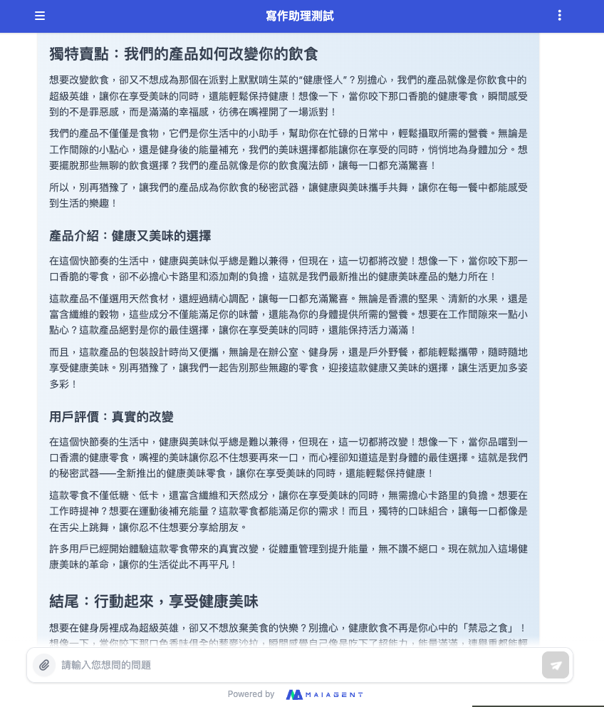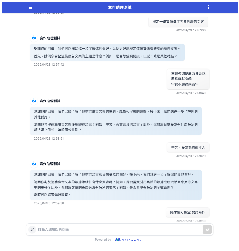 接著，您可至 AI 助理問答介面 提出寫作需求。AI 助理將引導您逐步填寫撰寫文案所需的關鍵資訊，例如：