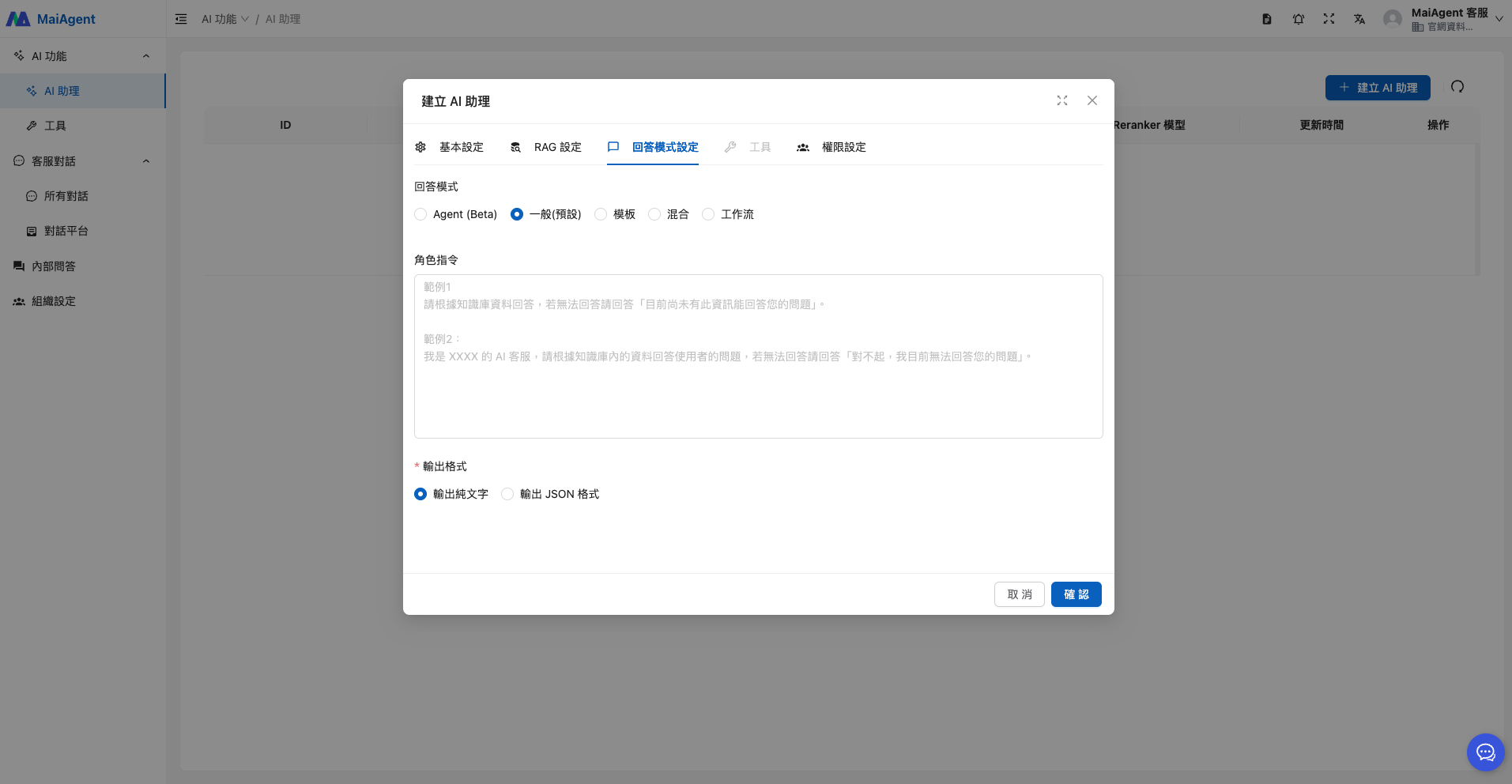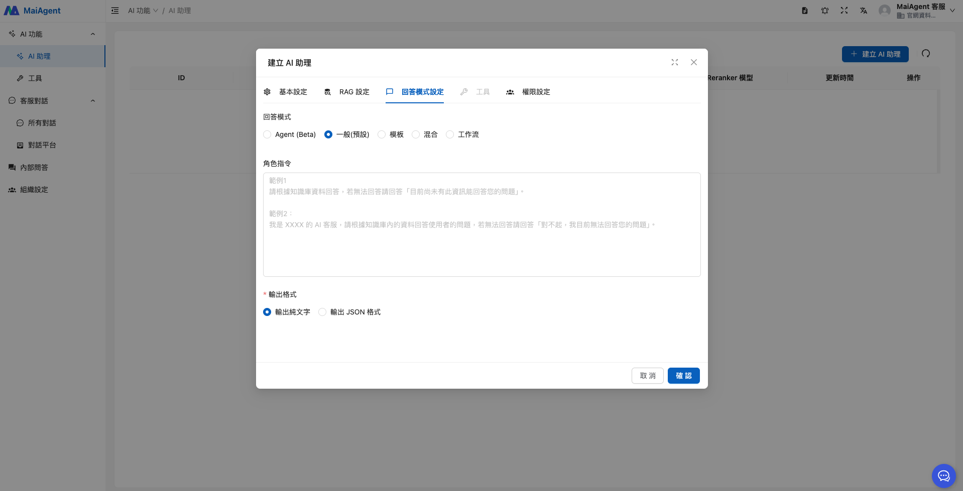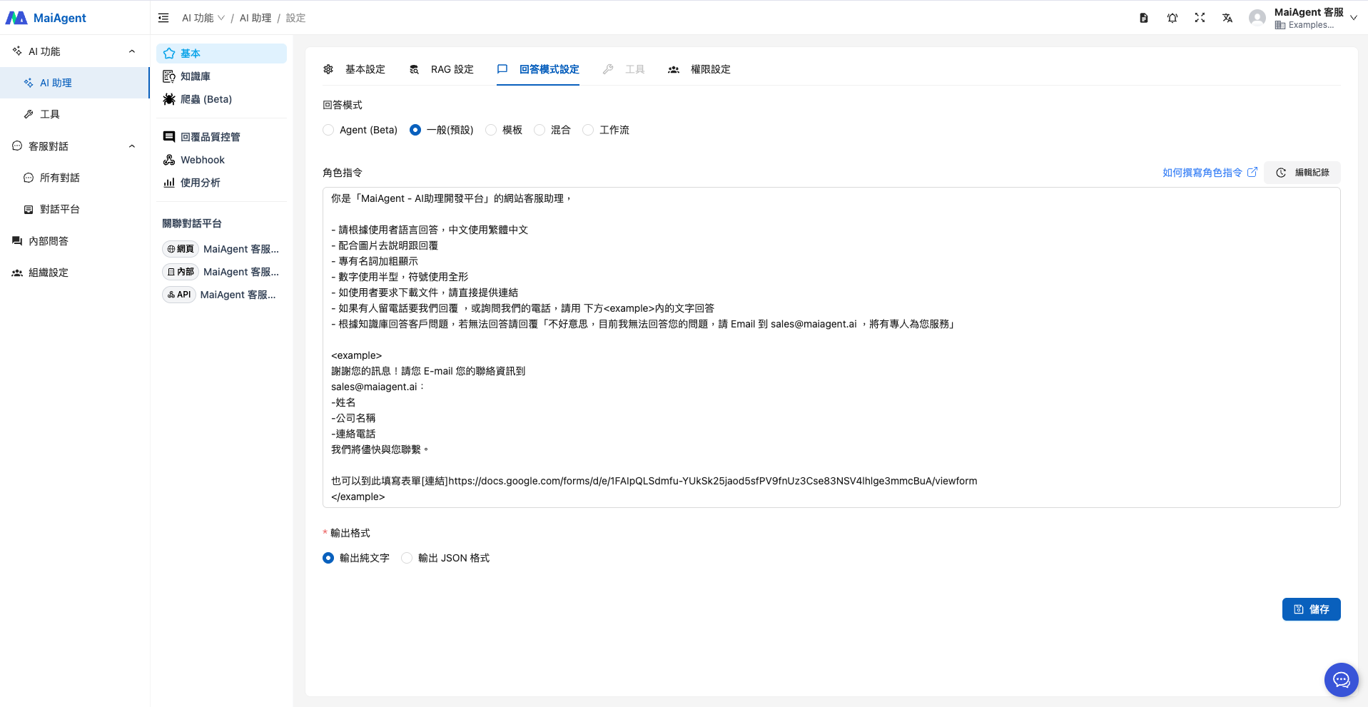 選擇 「<mark style="color:blue;">回答模式設定</mark>」 頁籤，回答模式選擇 <mark style="color:blue;">「一般（預設）」</mark>，於 「<mark style="color:blue;">角色指令</mark>」 欄位，填寫您為該 AI 助理訂定的角色指令。輸出格式，可選擇輸出純文字或 JSON 格式作使用。