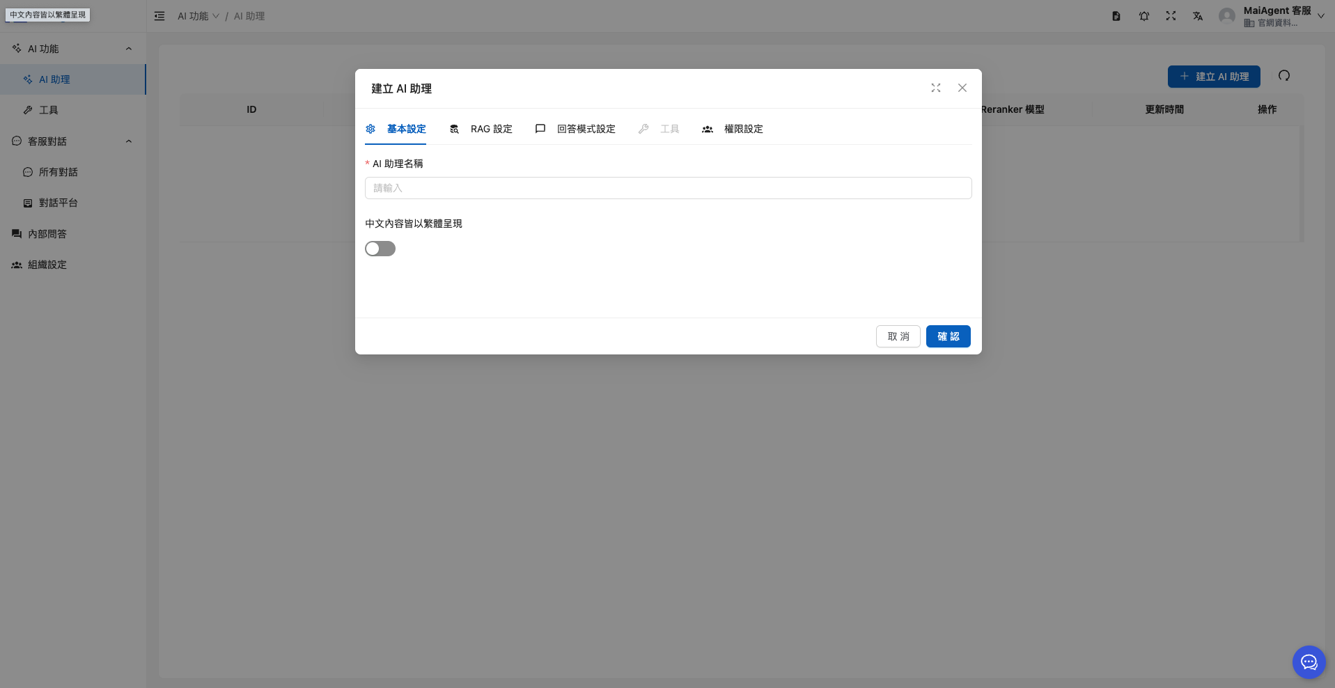 選擇 「基本設定」 頁籤，在 「<mark style="color:blue;">AI 助理名稱</mark>」 欄位，填寫 AI 助理的名稱。可以針對這位 AI 助理的主要任務來命名，例如 XX AI 客服， XX 法規查詢小幫手，XX 專案智慧助理。