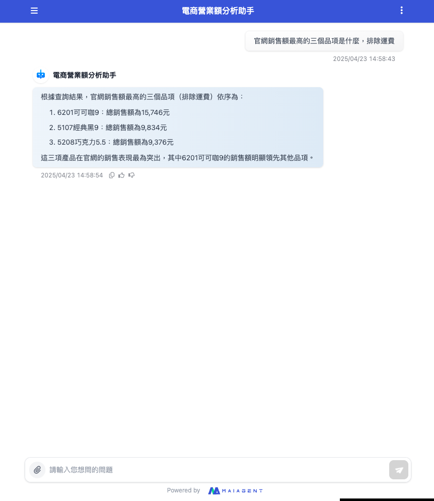 現在，透過 MaiAgent 的 Agent 模式，系統將可使用 Text to SQL 工具，自動將自然語言問題轉換為對應的 SQL 語法，並即時查詢資料庫，迅速給出分析結果。