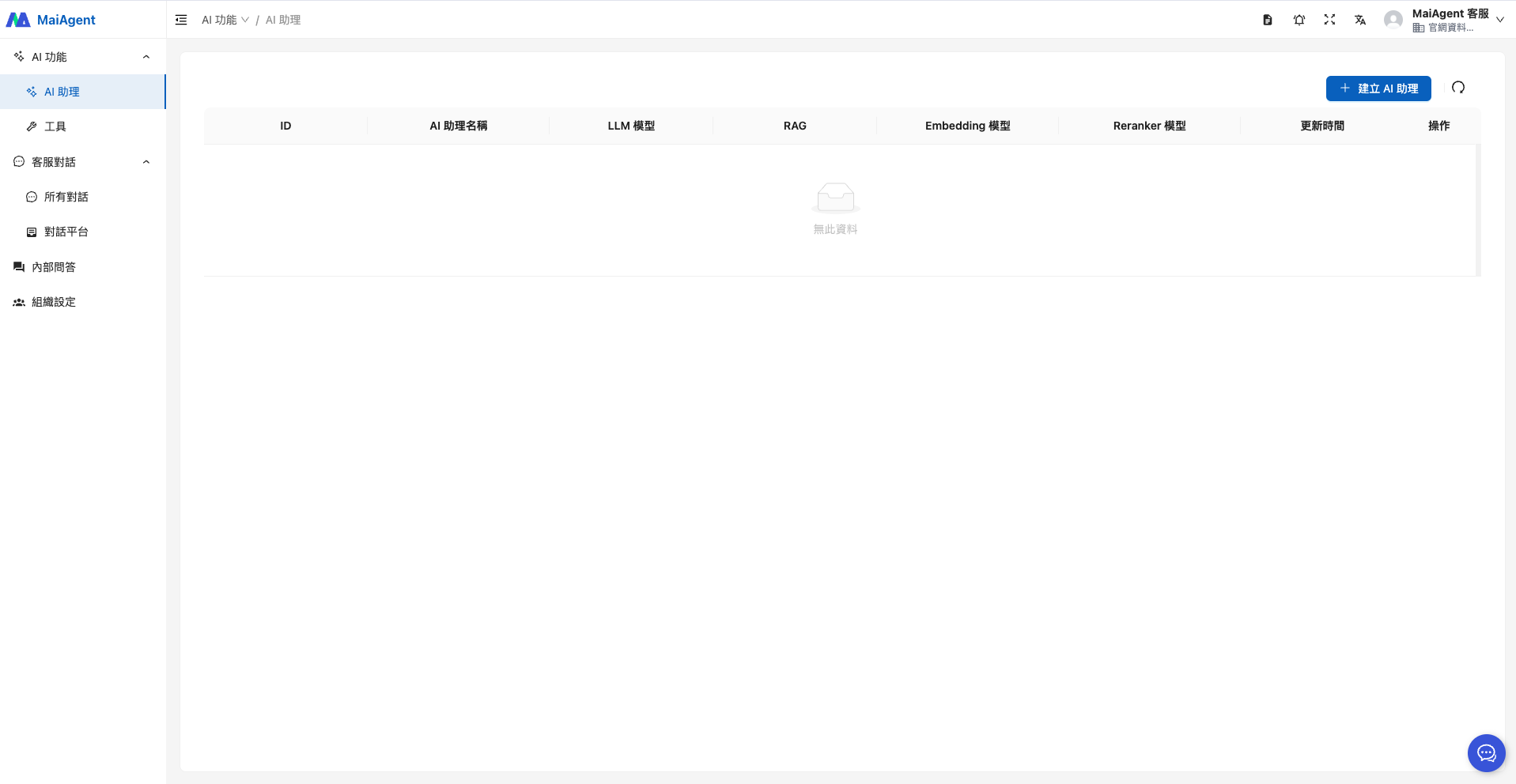 進入左側功能欄 「<mark style="color:blue;">AI 功能</mark>」中「<mark style="color:blue;">AI 助理</mark>」，點選右上方的 「<mark style="color:blue;">+建立AI助理</mark>」。