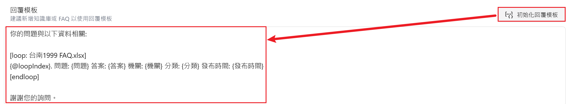 此時我們回到編輯回覆模板，按下右上角 「<mark style="color:blue;">**初始化回覆模板**</mark>」，您就會看到系統依據您剛剛上傳到知識庫的文件，產生回覆範例。