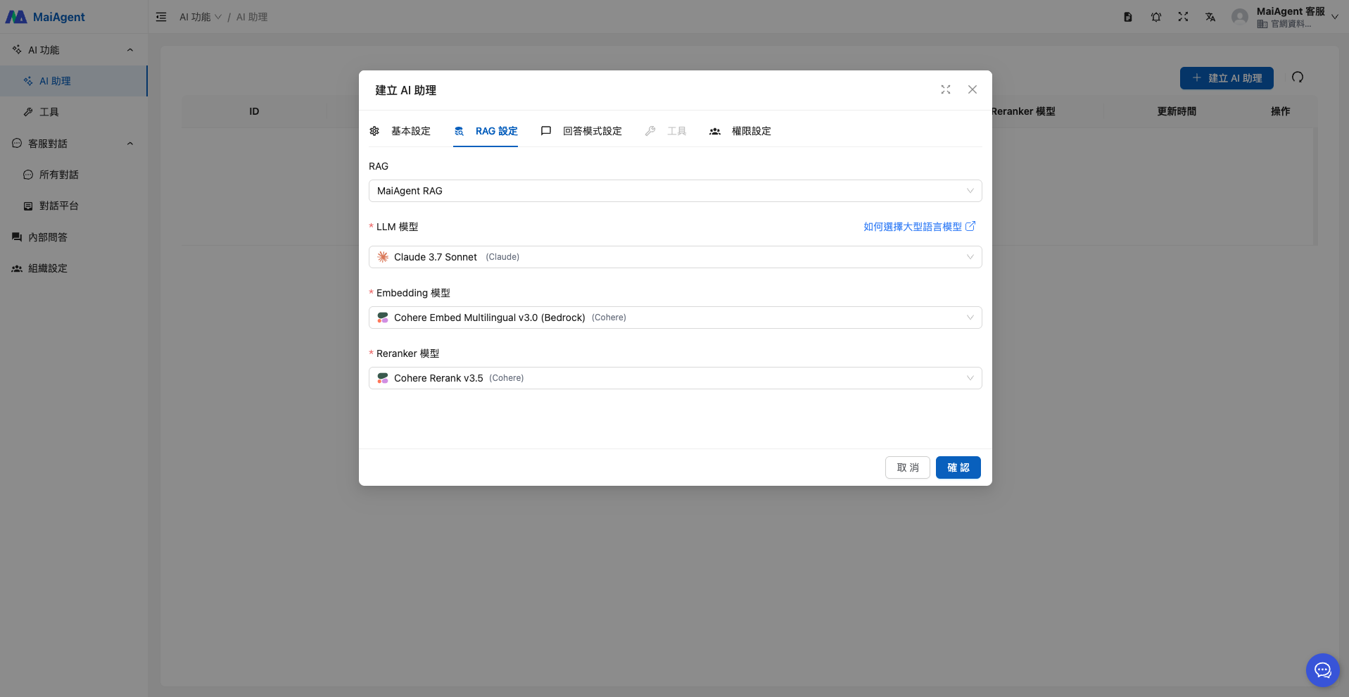 選擇 「<mark style="color:blue;">RAG 設定</mark>」 頁籤，在 「<mark style="color:blue;">RAG</mark>」 下拉式選單當中，挑選不同的 RAG（Retrieval-Augmented Generation，檢索增強生成）。如無特殊需求，<mark style="color:green;">預設為 MaiAgent RAG</mark>。