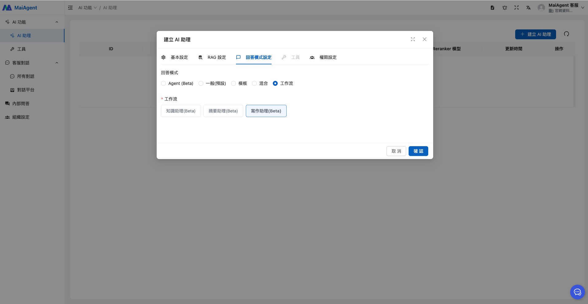 請前往「回答模式設定」頁籤，並選擇 <mark style="color:blue;">**「工作流」**</mark> 作為回覆模式。\