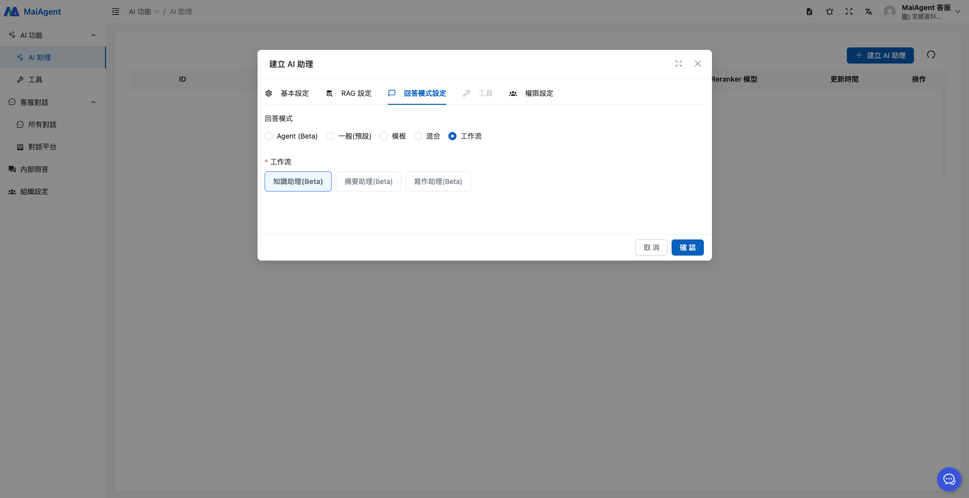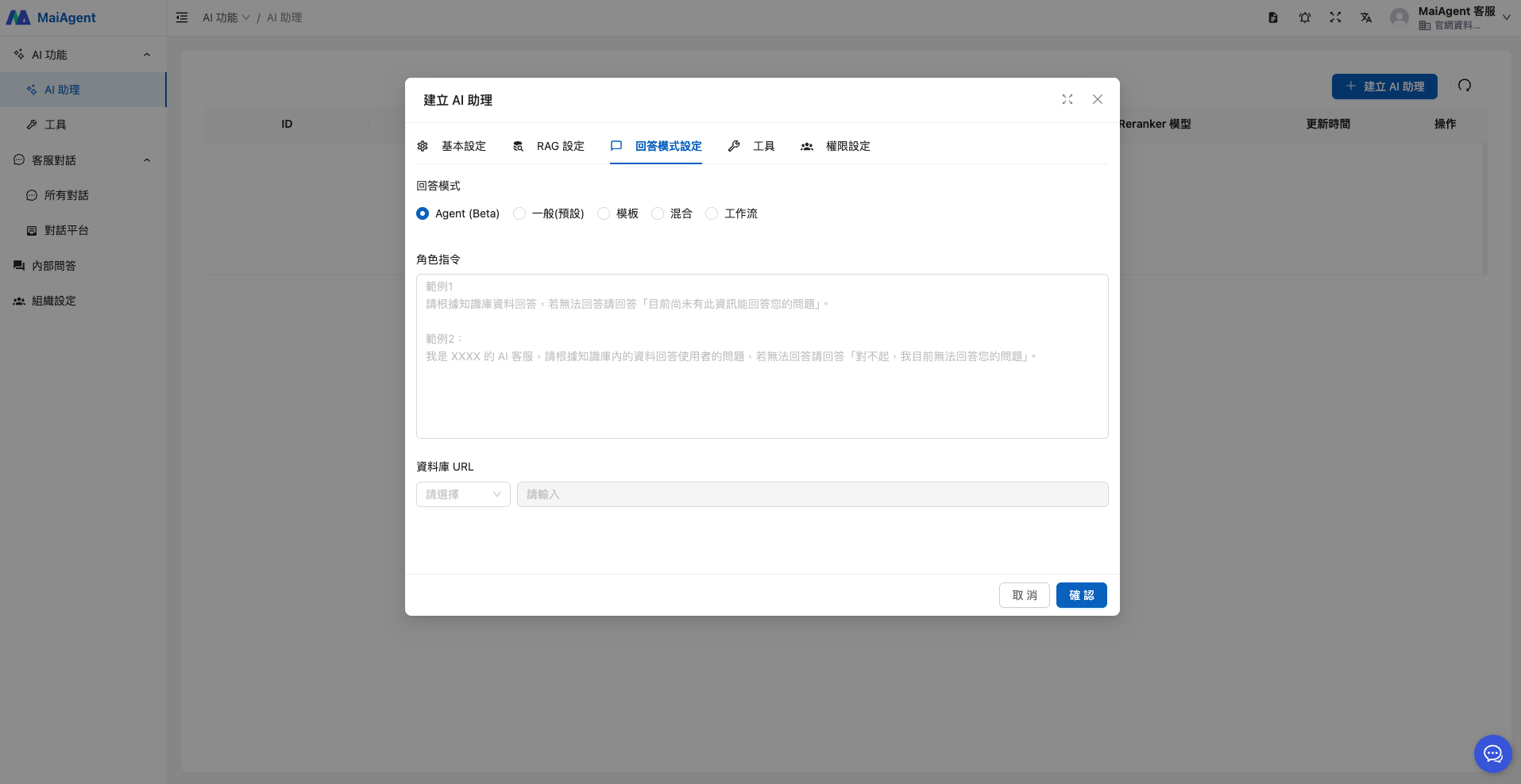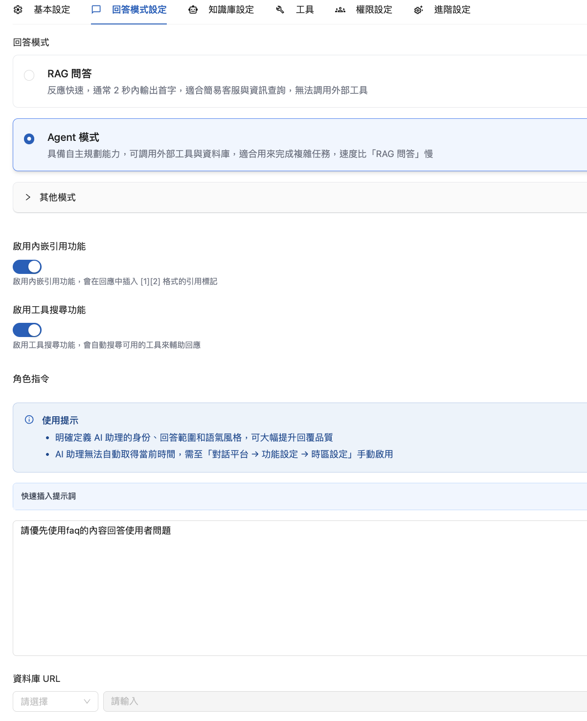 首先，「回答模式設定」 頁籤，選擇 <mark style="color:blue;">**「Agent」**</mark> 作為回覆模式