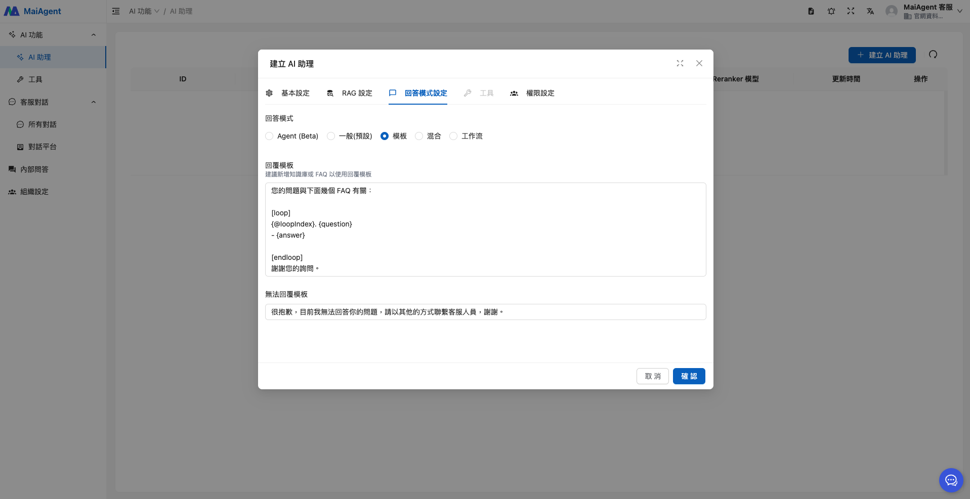 **1. 選擇 「**<mark style="color:blue;">**回答模式設定**</mark>**」 頁籤，回答模式選擇&#x20;**<mark style="color:blue;">**「模板」**</mark>