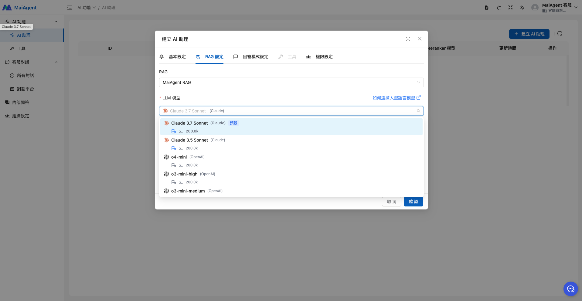 選擇 「<mark style="color:blue;">RAG 設定</mark>」 頁籤，在 「<mark style="color:blue;">LLM 模型</mark>」 下拉式選單當中，可以挑選不同的大型語言模型，如無特殊需求，<mark style="color:green;">預設為 Claude 4.5 Sonnet</mark>。