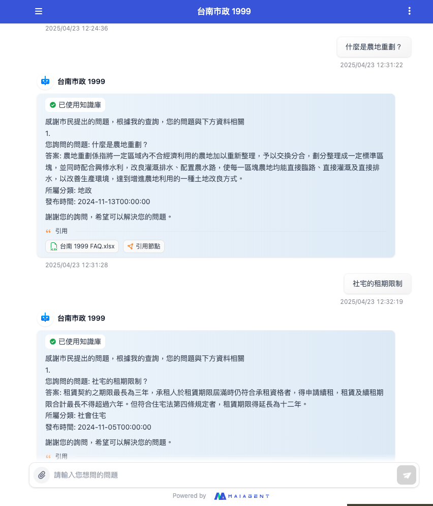 當我們回到 AI 助理問答介面，詢問到相關問題，AI 助理的回覆就會完全依照剛剛編輯的**模板格式**和 **FAQ 文件內容**做回覆。