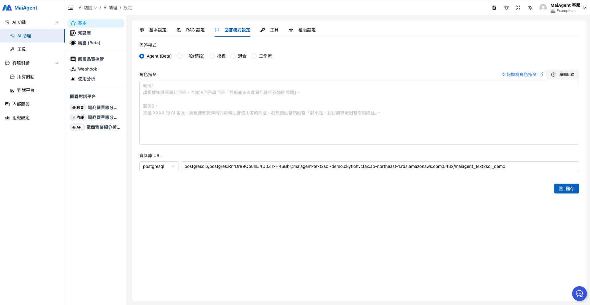 使用 MaiAgent 知識庫進行 Text to SQL 詳細介紹，請參考：[使用 MaiAgent 知識庫進行 Text to SQL](https://docs.maiagent.ai/database/text-to-sql-maiagent)