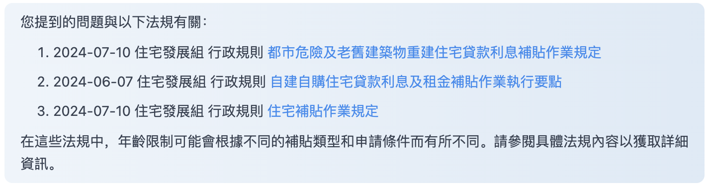 Taking the "Government Legal Regulation Search Assistant" as an example, as shown in the legal regulation announcements from the Ministry of the Interior's National Land Management Agency below, keyword search was used in the past. Now, we hope to improve user convenience through generative AI technology. This can be done on MaiAgent.