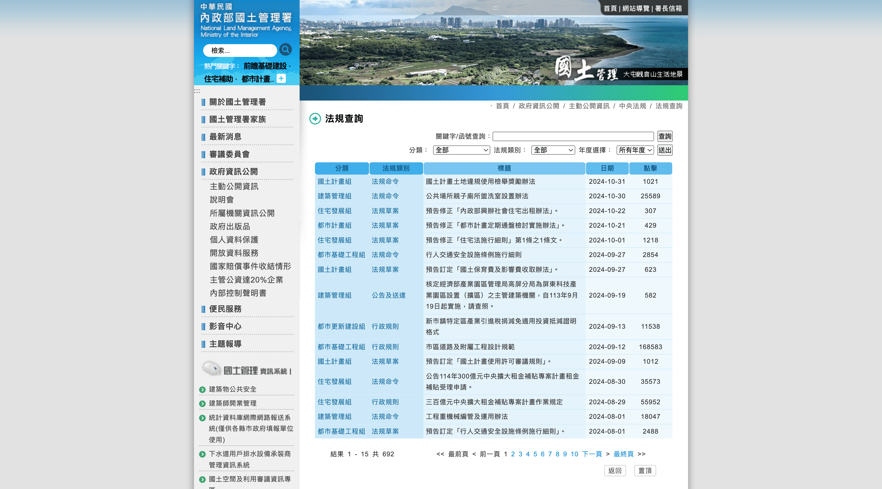 | Public Place Parent-Child Toilet and Washroom Installation Measures              | Building Management Division       | Regulatory Order | 2024-10-30 | Regulation Content… | [https://www.nlma.gov.tw//政府資訊公開/主動公開資訊/中央法規/法規查詢/30-建管組/28714-公共場所親子廁所盥洗室設置辦法.html](https://www.nlma.gov.tw/%E6%94%BF%E5%BA%9C%E8%B3%87%E8%A8%8A%E5%85%AC%E9%96%8B/%E4%B8%BB%E5%8B%95%E5%85%AC%E9%96%8B%E8%B3%87%E8%A8%8A/%E4%B8%AD%E5%A4%AE%E6%B3%95%E8%A6%8F/%E6%B3%95%E8%A6%8F%E6%9F%A5%E8%A9%A2/30-%E5%BB%BA%E7%AE%A1%E7%B5%84/28714-%E5%85%AC%E5%85%B1%E5%A0%B4%E6%89%80%E8%A6%AA%E5%AD%90%E5%BB%81%E6%89%80%E7%9B%A5%E6%B4%97%E5%AE%A4%E8%A8%AD%E7%BD%AE%E8%BE%A6%E6%B3%95.html)                                                   |