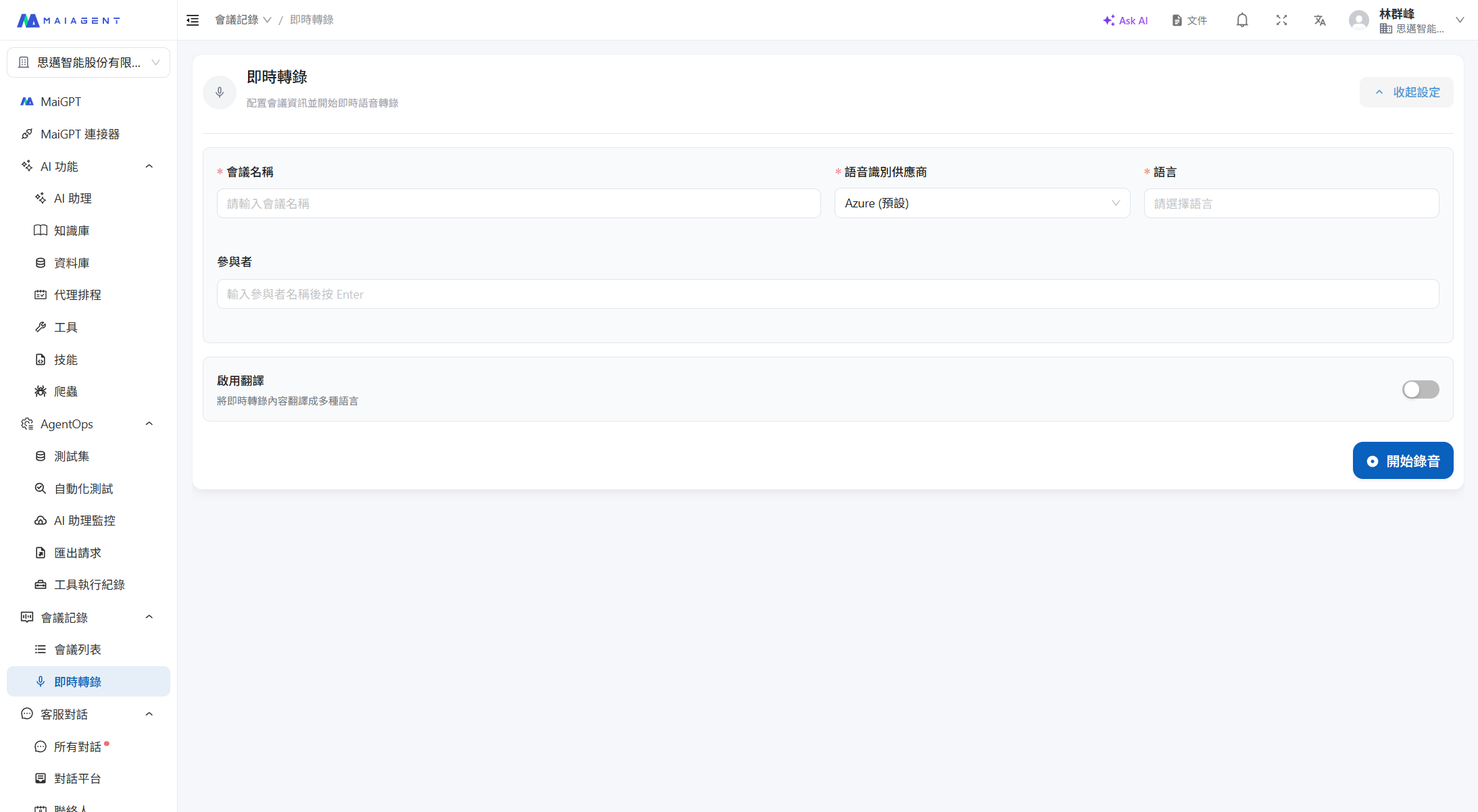 建立會議記錄後，點擊「開始錄音」即可啟動即時轉錄。