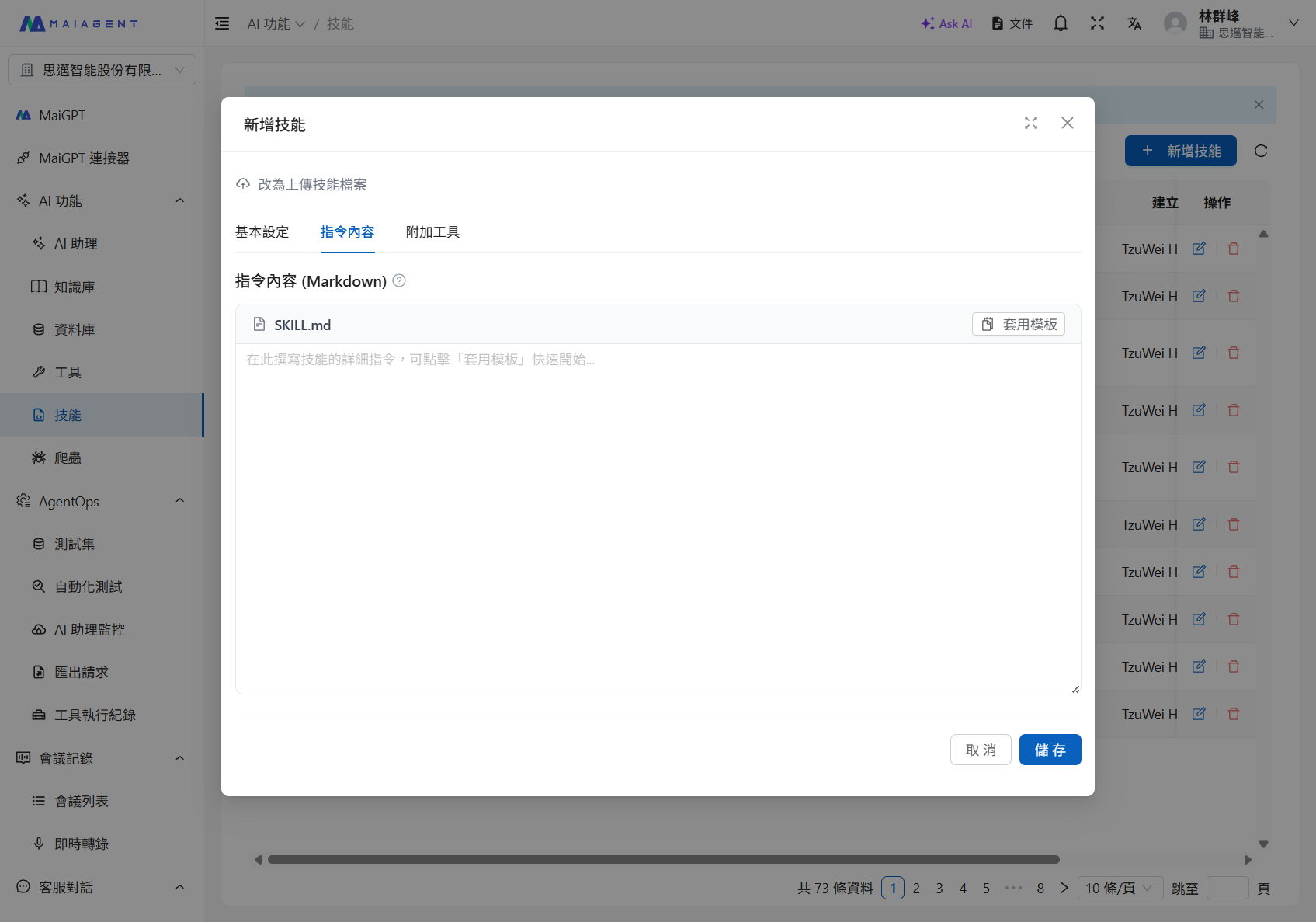 <figure><img src="https://1593648278-files.gitbook.io/~/files/v0/b/gitbook-x-prod.appspot.com/o/spaces%2Fmzb5NG9GDzFP2YDKeYVl%2Fuploads%2Fgit-blob-208ccb129564da27338d716f0cabf4497a34af3f%2Fskills-new-instructions.png?alt=media" alt=""><figcaption><p>指令內容頁籤 — 支援 Markdown 格式與套用模板</p></figcaption></figure>