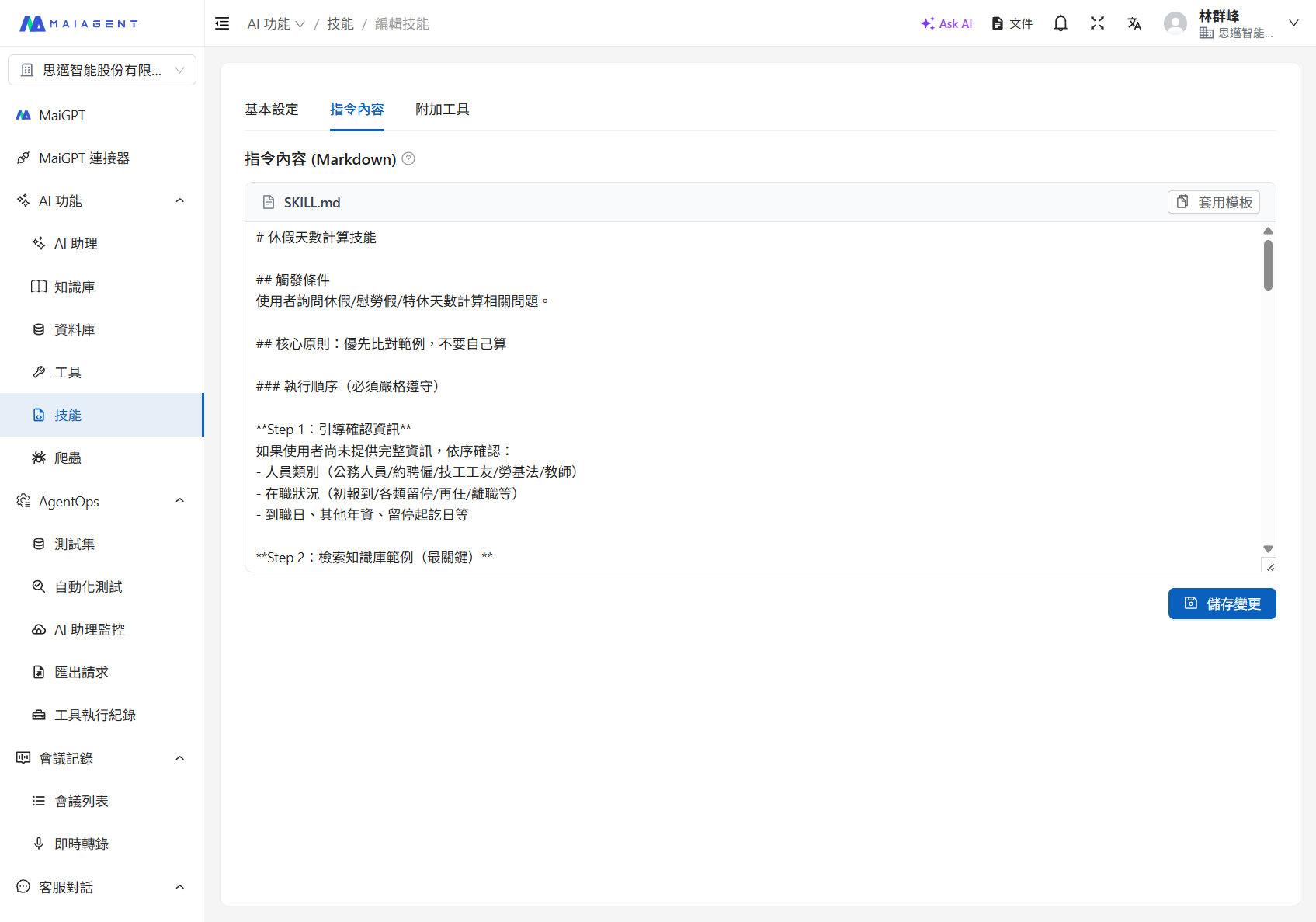 編輯 Markdown 格式的技能指令。這些指令會在 AI 助理展開技能時作為執行依據。