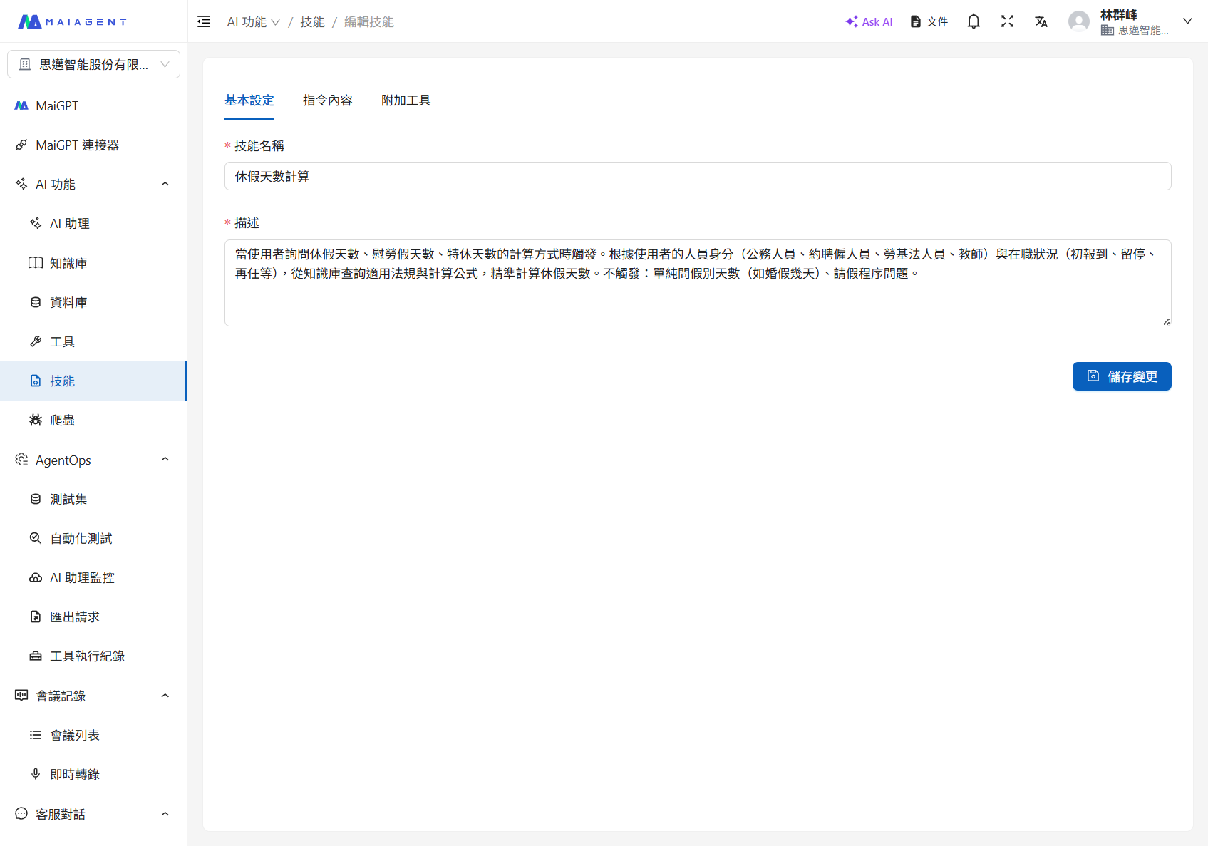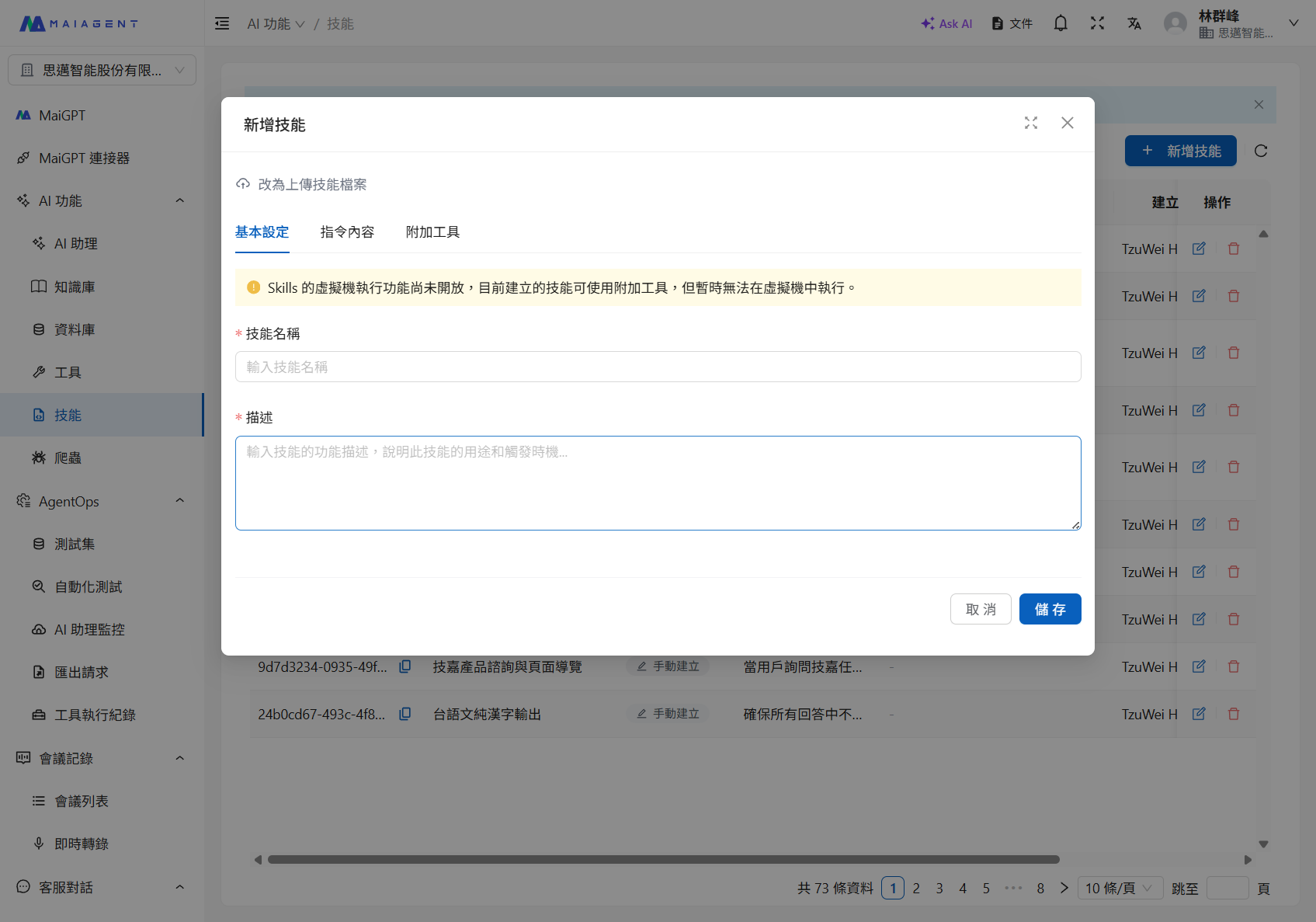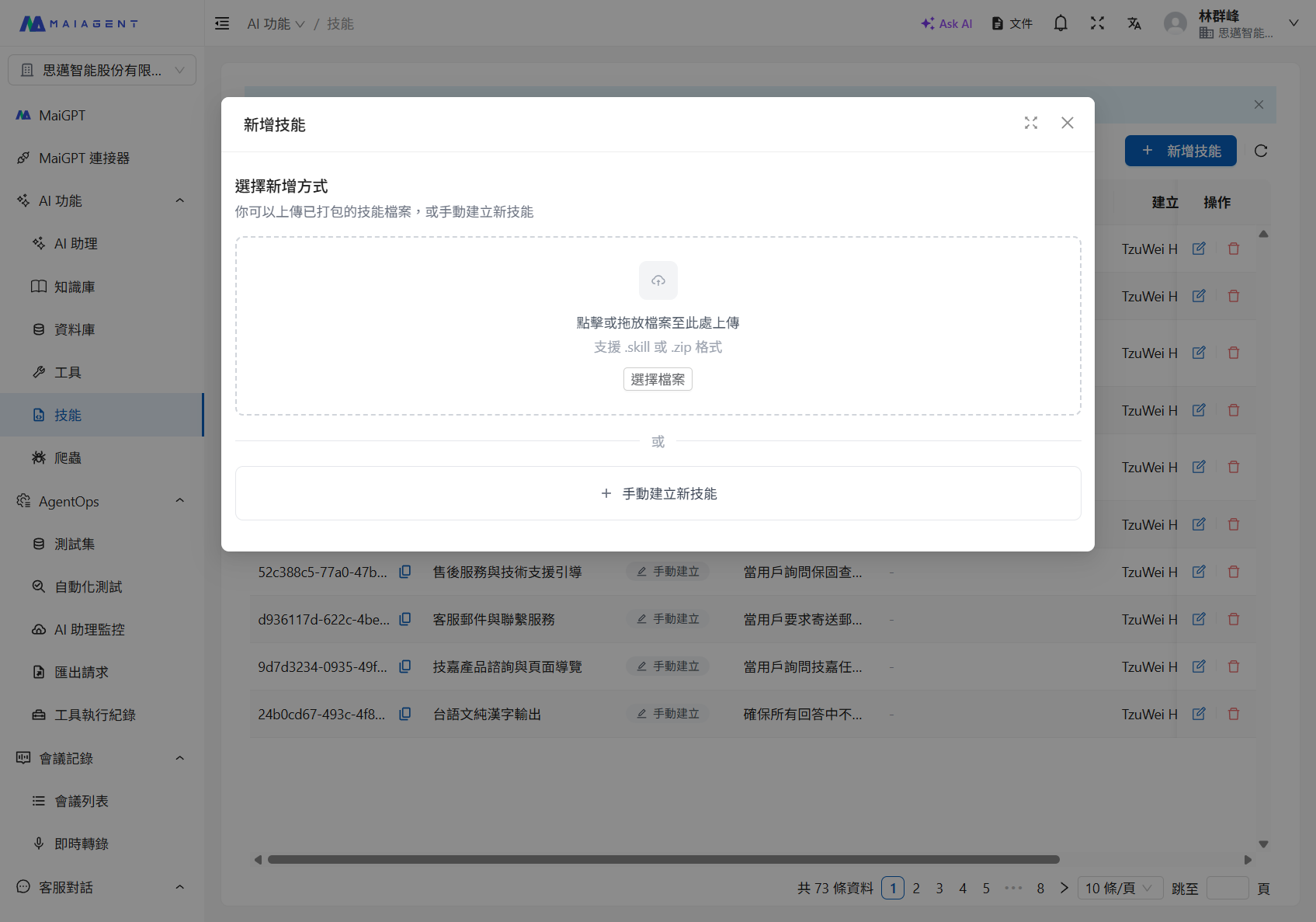 如果您還不了解技能是什麼，請先閱讀：[技能功能概覽](https://docs.maiagent.ai/skills/skill-overview)