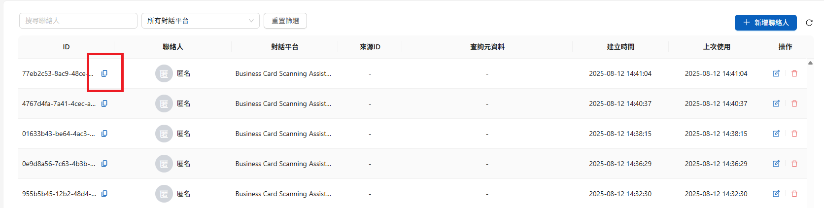 After adding contact name and specifying conversation platform, contact information can be created. Click the copy button to copy the Contact ID (used as Web Chat initialization parameter ContactId)