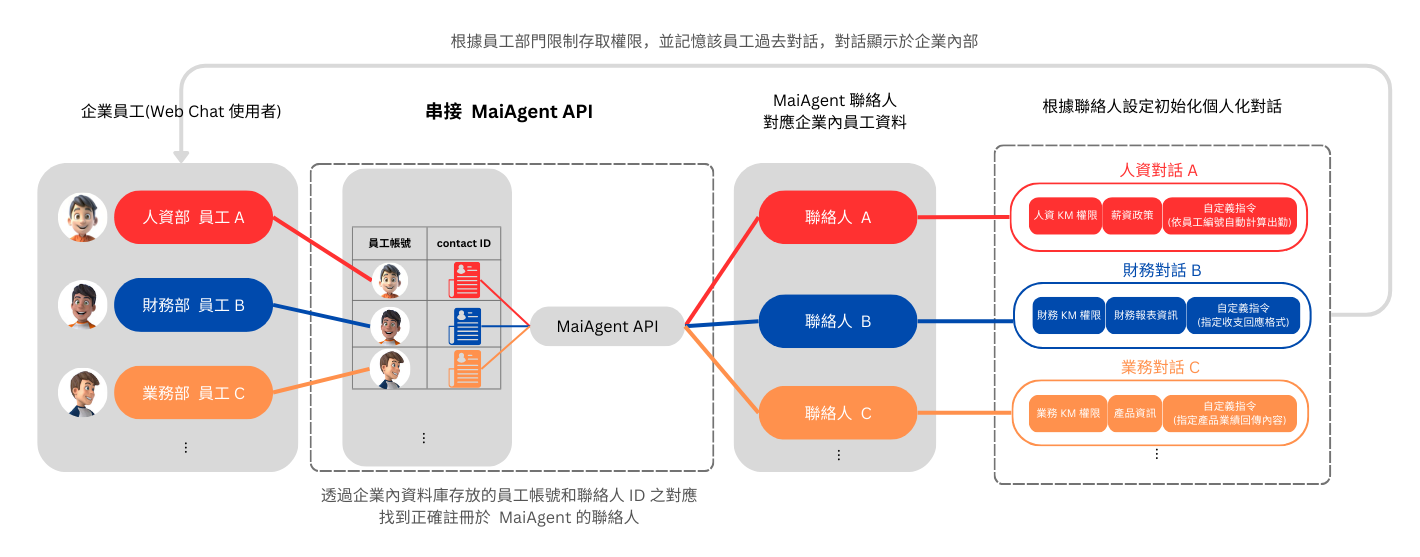 * **Web Chat Embedding**: When Web Chat is embedded in enterprise website, without MaiAgent member data, enterprises can achieve conversation permission management through contact integration settings
