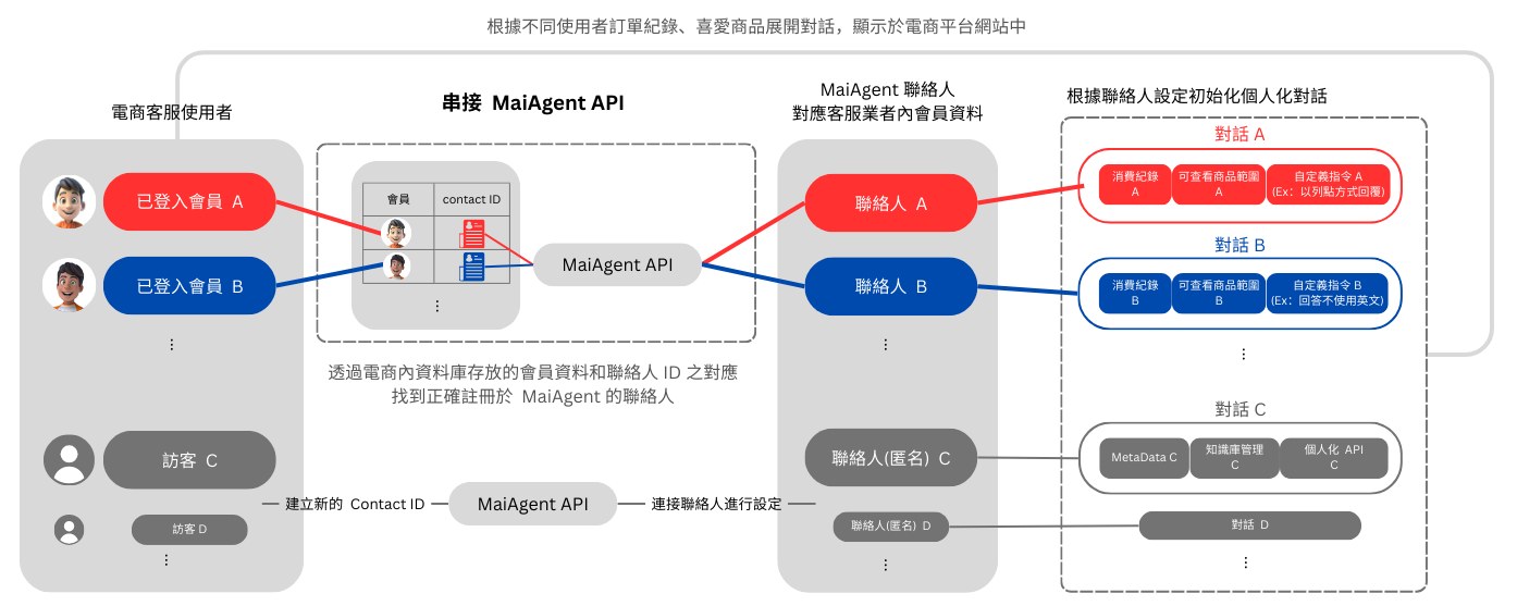 Through the contact information corresponding to the customer's enterprise data in MaiAgent, when integrating with MaiAgent API, MaiAgent can correctly trace back the past memory information and permission management content related to that consumer by passing the corresponding contact ID, rather than irrelevant information or permission settings of other consumers.