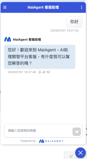 <figure><img src="https://3415477754-files.gitbook.io/~/files/v0/b/gitbook-x-prod.appspot.com/o/spaces%2FNBTi475lqozGpB7xObpE%2Fuploads%2Fgit-blob-bb81392bc29a9771001ca21c0572cd2a94c123fc%2F%E6%88%AA%E5%9C%96%202025-07-07%20%E4%B8%8B%E5%8D%886.32.19.png?alt=media" alt=""><figcaption><p>AI Assistant embedding screen</p></figcaption></figure>