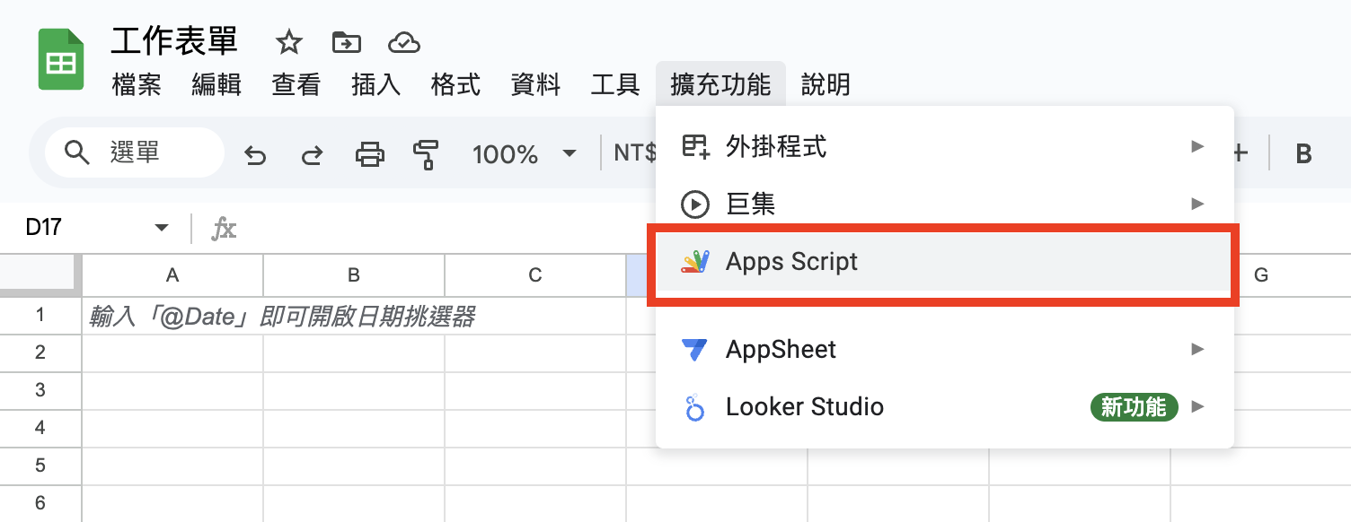 Click "Extensions" > "Apps Script" in the top menu.