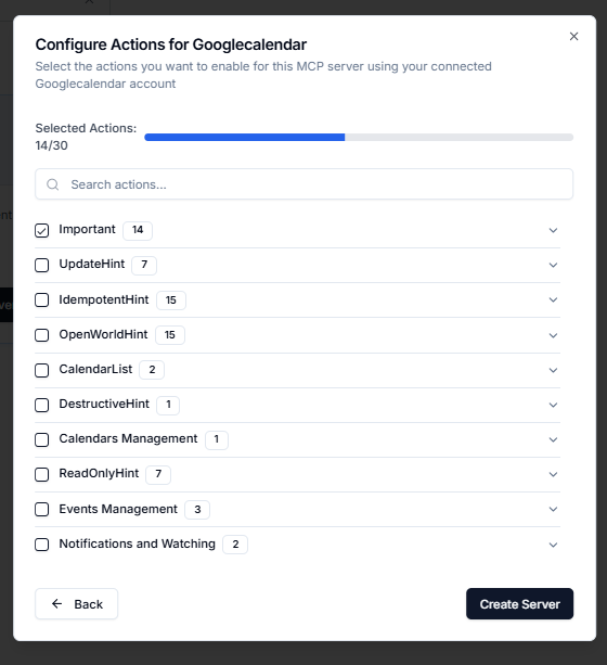 3. Select the tools you want to authorize and click "<mark style="color:blue;">Create Server</mark>" to establish the connection