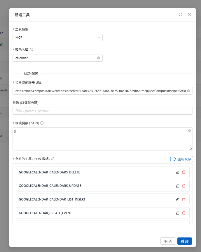 The system will automatically fetch the connected tools and display them in the "Allowed Tools" list below.