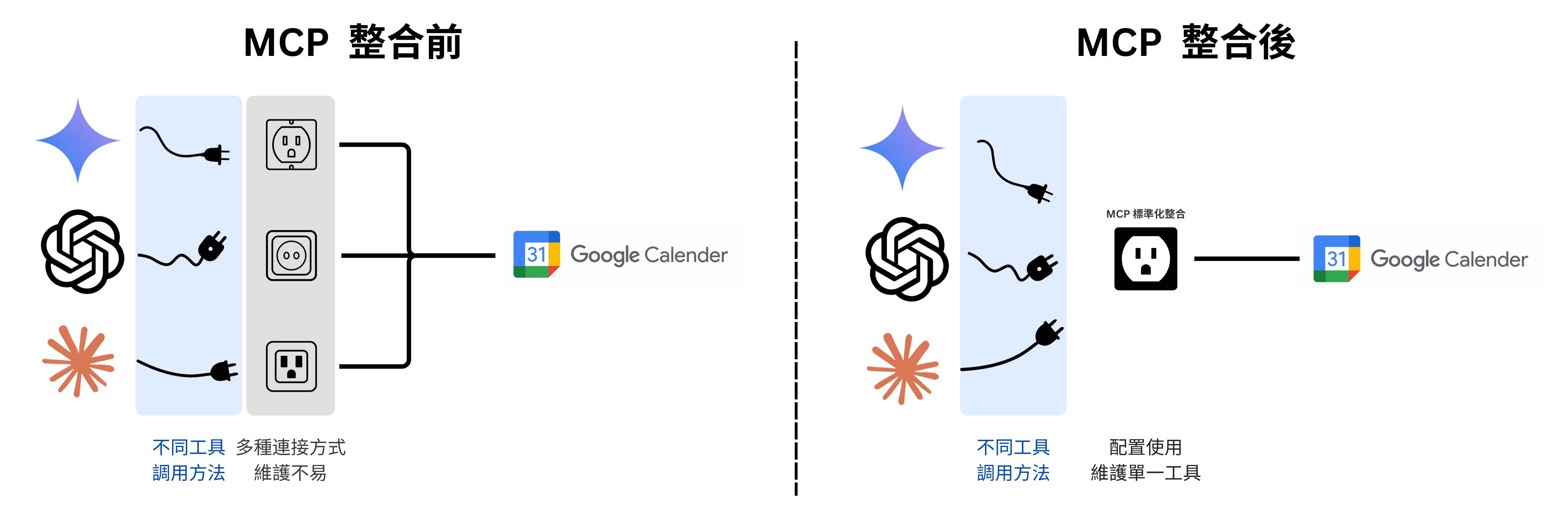 可以把工具使用想像成插頭，插上插頭通電後才能使用服務，傳統上，每個 LLM 會自己開發出不同的工具使用方式，就像不同規格的插頭一樣，會需要多種插座才能使用，若想要讓 OpenAI 和 Claude 都能使用 Google Calendar 的服務，會需要開發人員設計出多種腳本讓不同的 AI 使用。