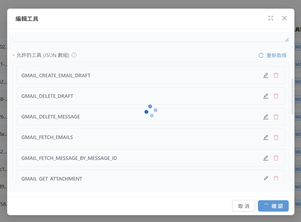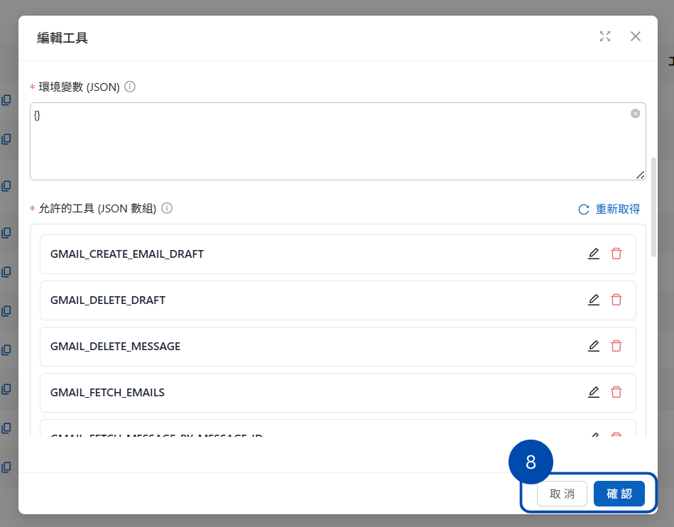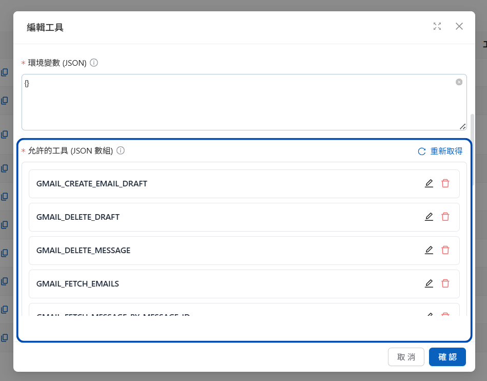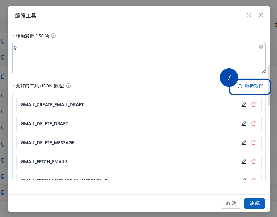 ### 5. 找到「<mark style="color:blue;">允許的工具(JSON 數組)</mark>」，點按重新取得