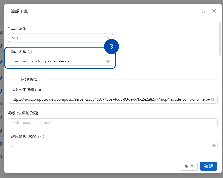 為工具設定清晰的顯示名稱，這邊設為 <mark style="color:blue;">Composio mcp for google calendar</mark>。